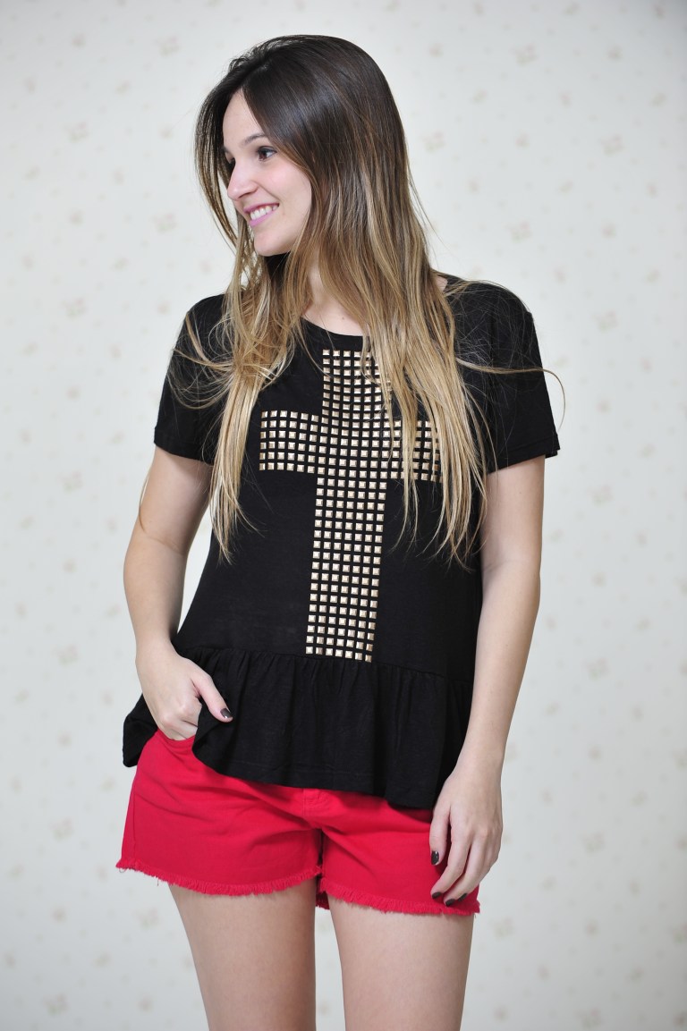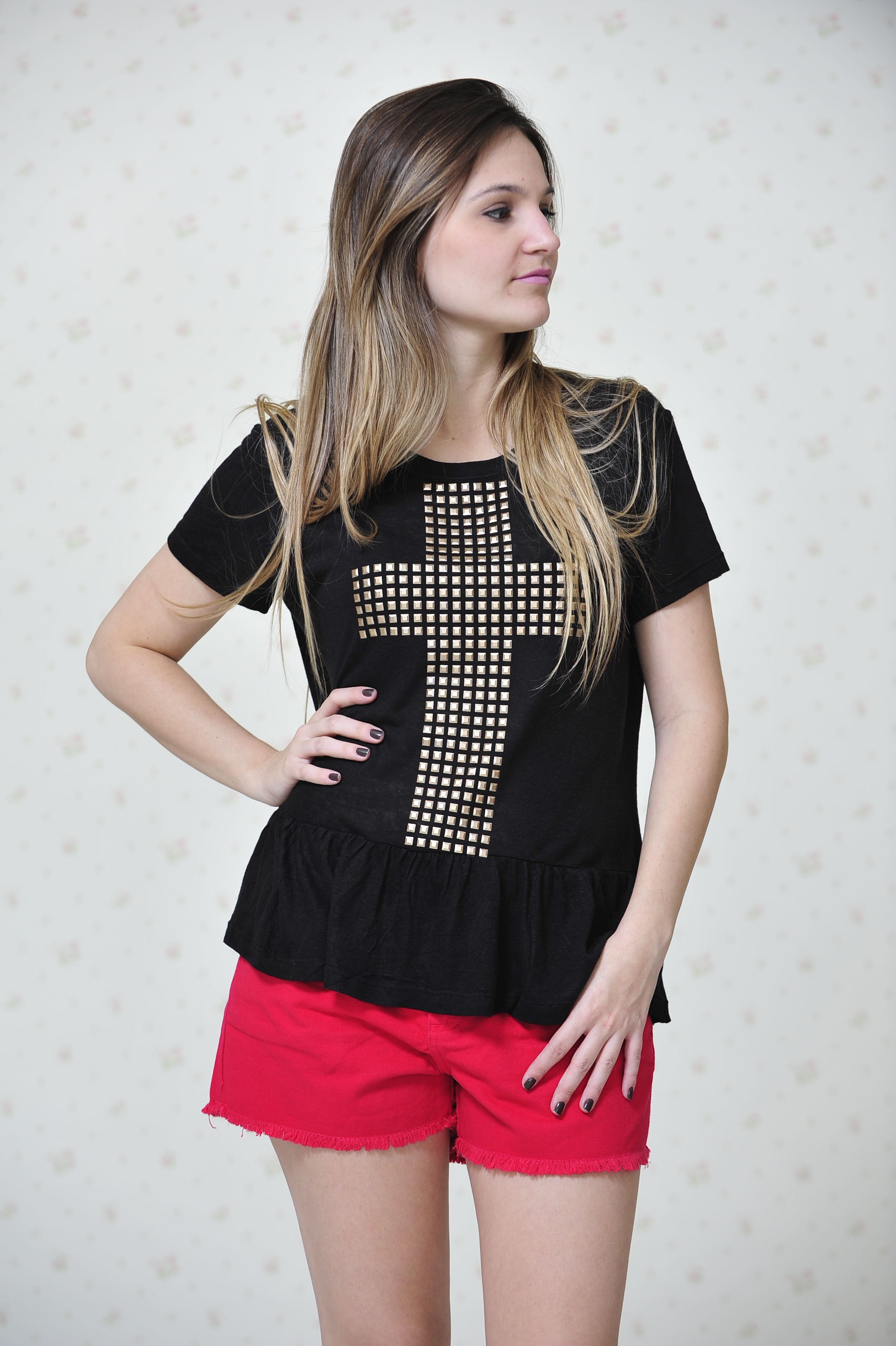 Quem disse que feriado não tem look Impactto Modas? Tem sim… Aproveitando o dia para descansar ou ficar com a família e/ou amigas(os)… Escolhi uma produção bem cool e descolada para passar a tarde. Um shortinho vermelho + t-shirt com uma cruz toda bordada de tachas.
