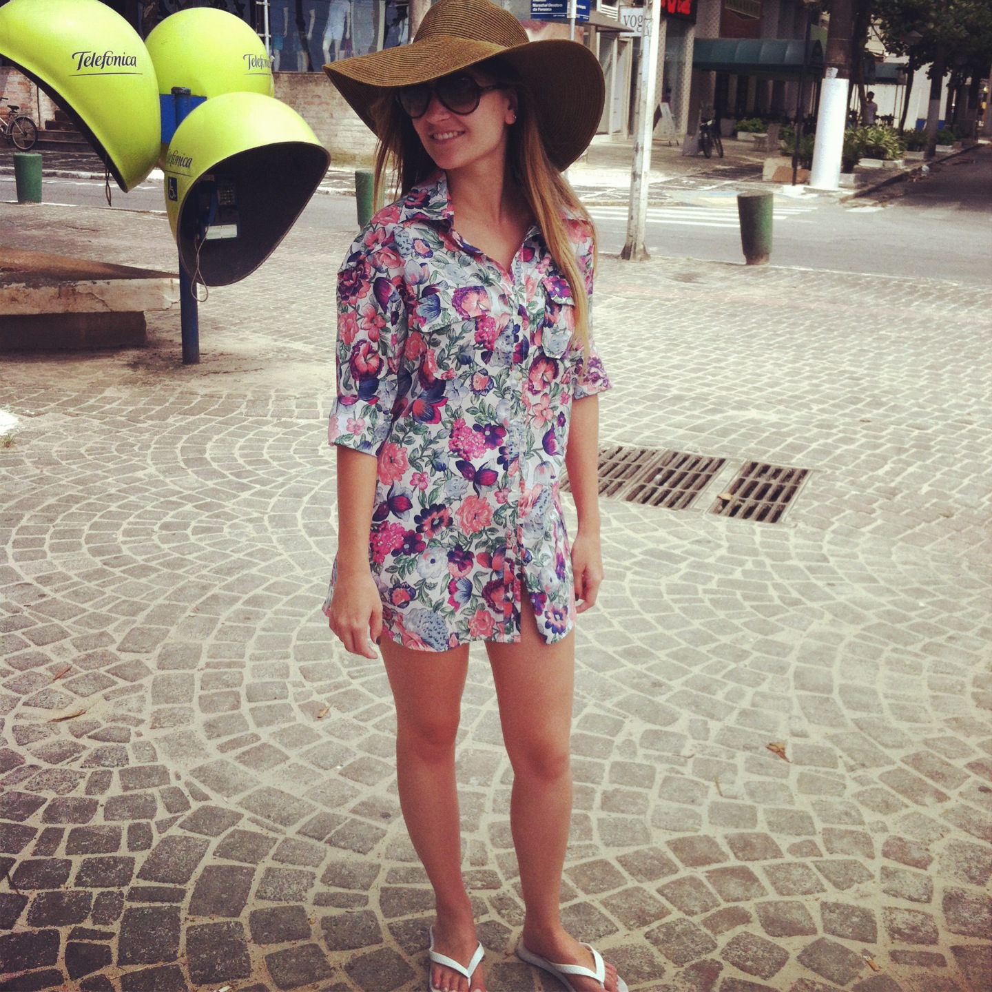 Look 5 – Camisão – Nesse look usei uma camisa floral, como ela tem uma modelagem maior, usei como se fosse um vestidinho ou uma saída de praia mesmo… E com um mega solzão nada melhor que um chapéu bem grande.