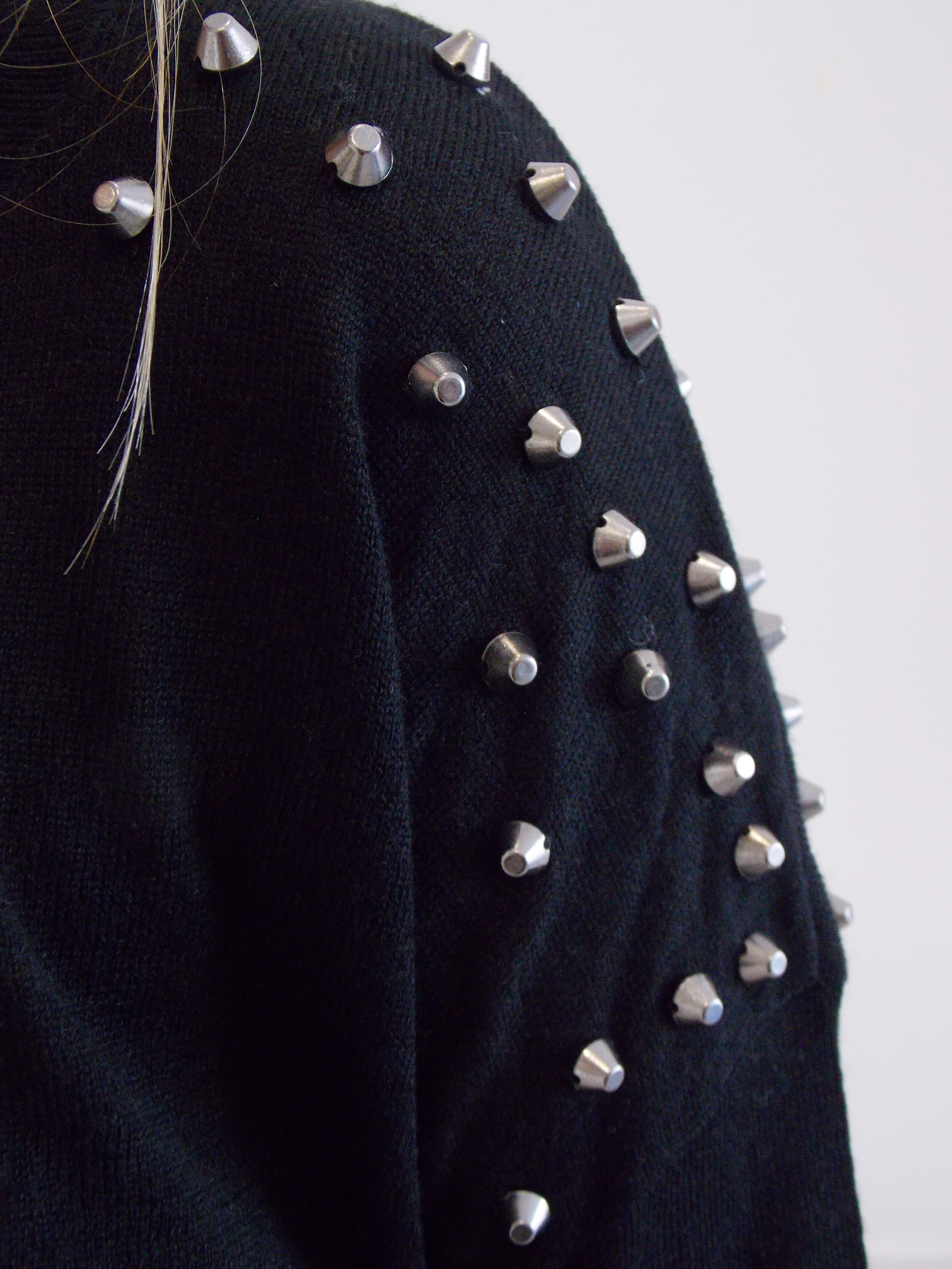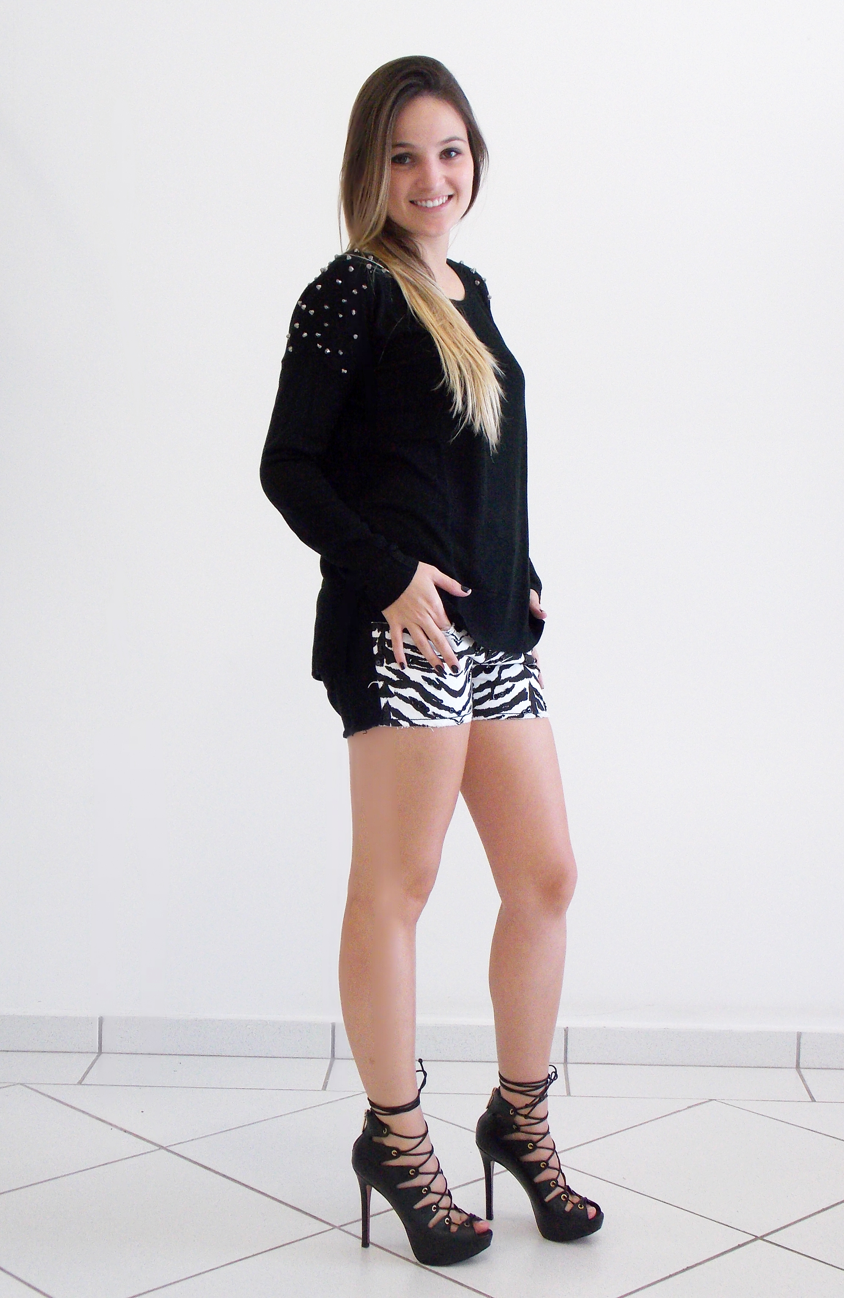 Look 1 – Short animal print – estampa de zebra + tricô preto com spikes nos ombros.