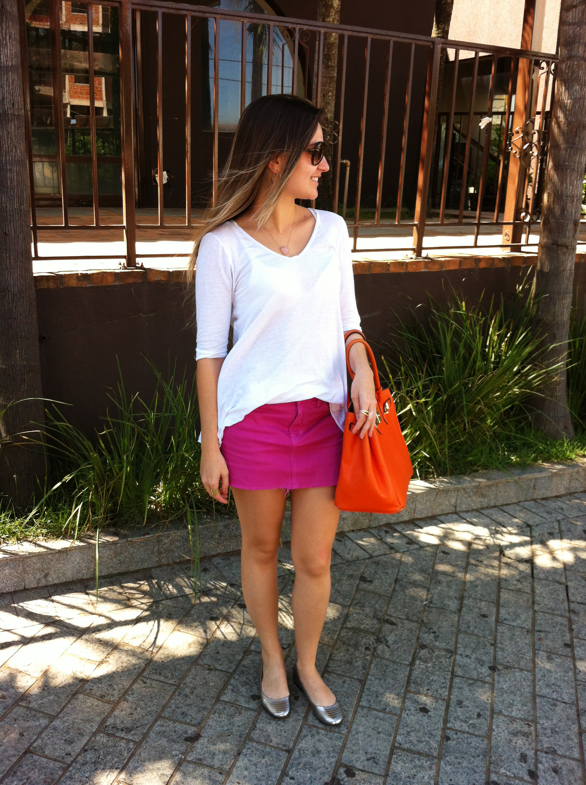 Um coisa que eu acho bacana é o mix de cores, no caso do look a saia pink com a bolsa laranja! Acho que fica super moderno e deixa o look estiloso! E vocês? Gostaram… Comentem, quero saber… Beijos!