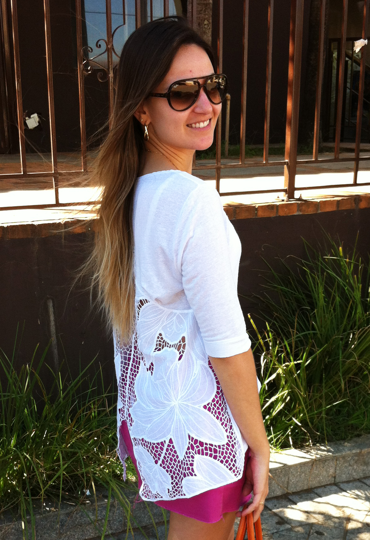 Olá meninas… Como passaram o feriado? Comeram muito chocolate? Viajaram!? O meu foi relax, super tranquilo, e sem ovos de páscoa – não sou muito fã! Na sexta-feira Santa fui almoçar com meu love no Barracão, o clima estava super gostoso, sol com uma brisa. Coloquei minha saia jeans pink e uma blusa super antiguinha, mas que é uma graça!!! Sempre que coloco faz o maior sucesso, ela tem um trabalhado lindo nas costas.