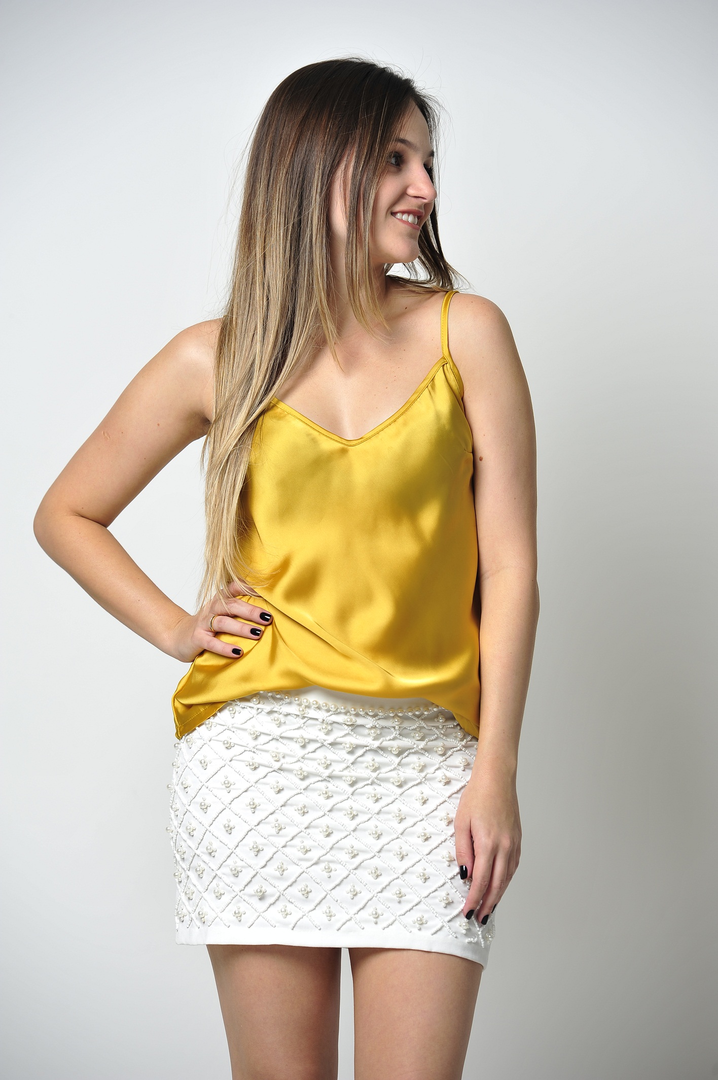 Meninas, o look da Impactto Modas de hoje é para arrasar no fim de semana. A saia Zara inspired toda bordada com mini pérolas é uma riqueza, super poderosa e feminina. Coloquei com uma regata de cetim na cor ouro e achei que a produção ficou linda!