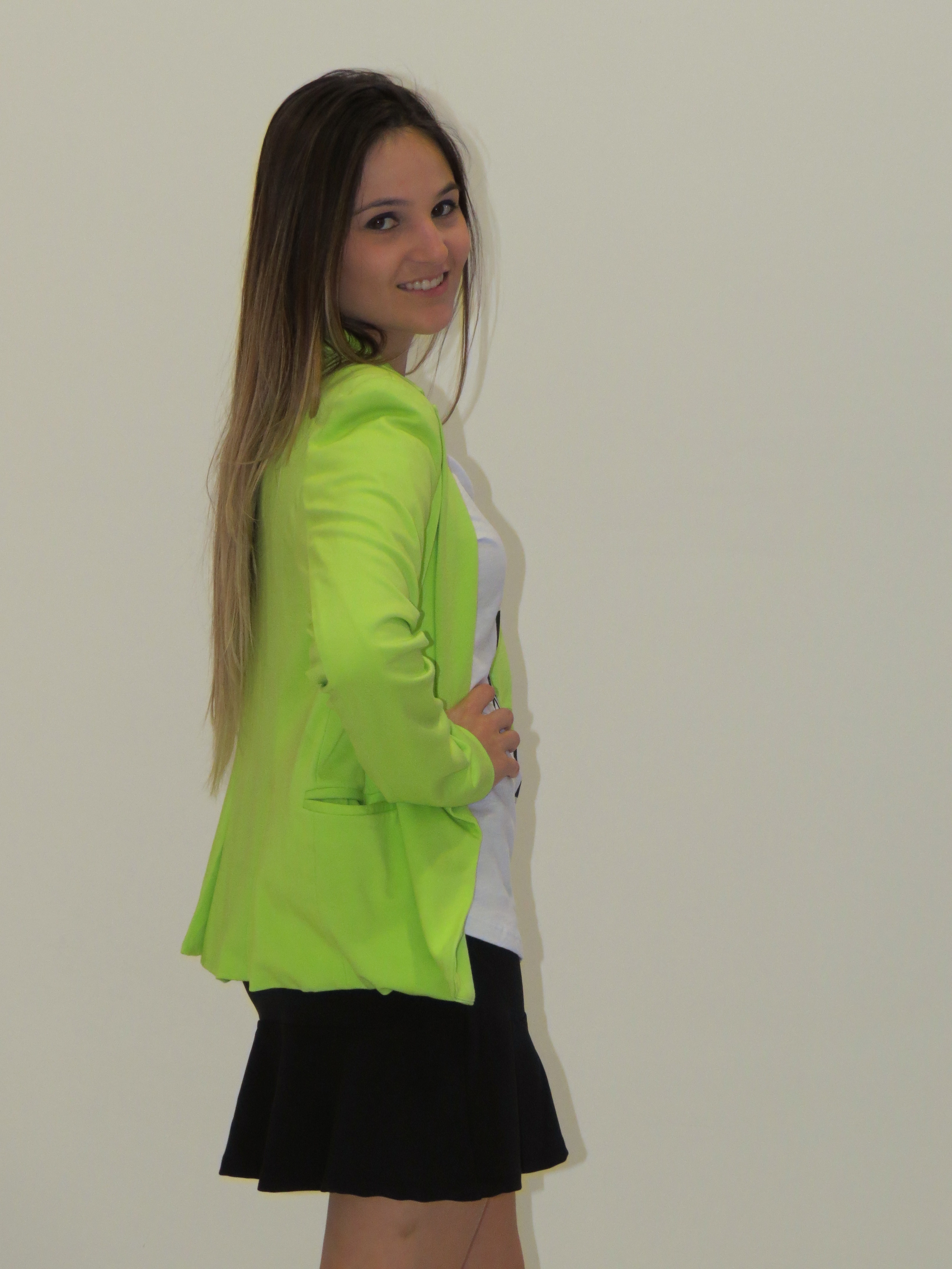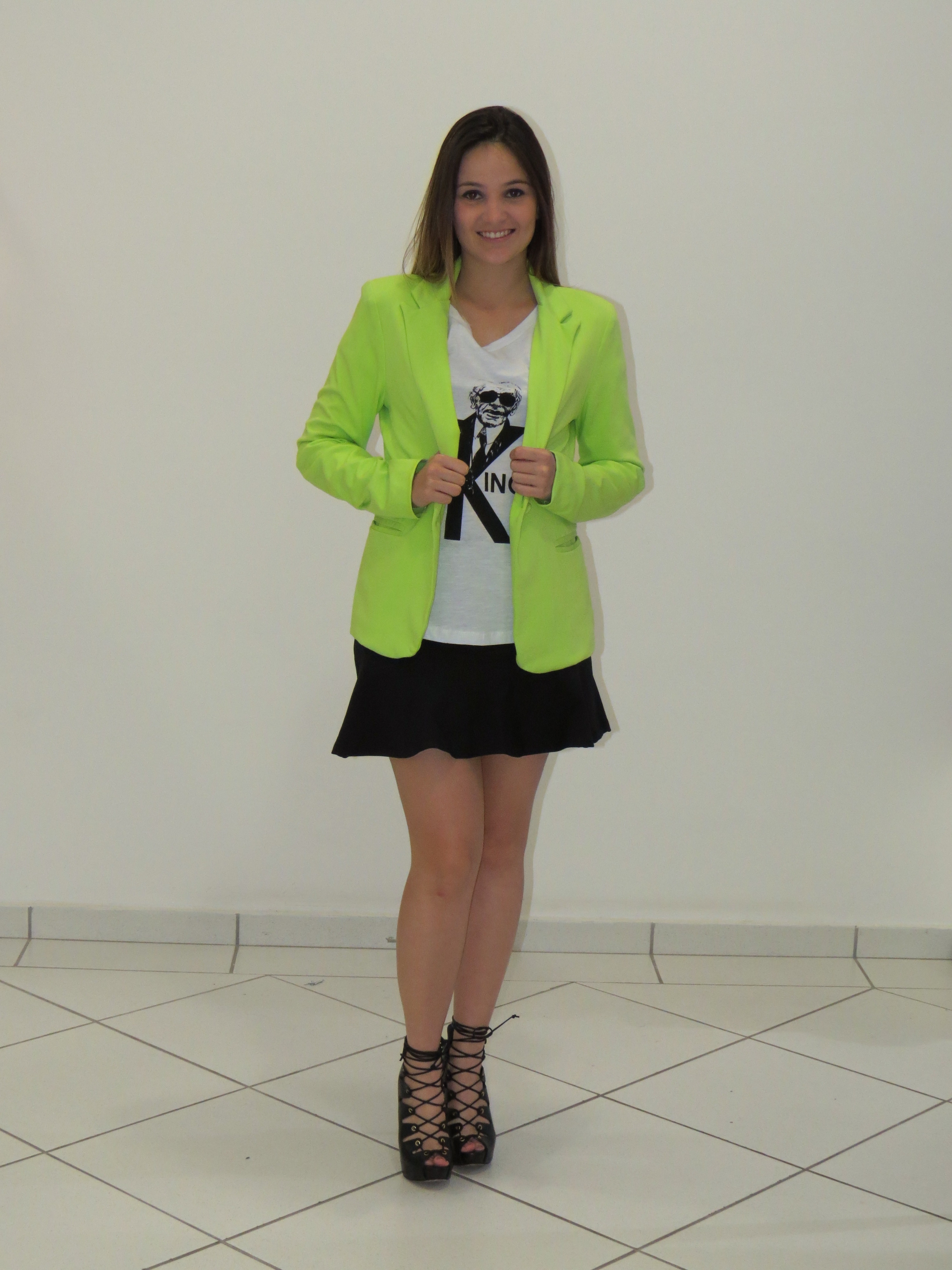 Meninas, hoje amanheceu um friozinho super gostoso por aqui. E quando está esse tempinho nada melhor que um bom blazer para no aquecer e deixar o look estiloso. A produção da Impactto Modas de hoje é com o blazer verde lima + t-shirt + saia de babado na barra. Adoro combinar uma peça chamativa, como o blazer verde lima, em looks P&B, acho que fica bem bacana! Uso muito produções assim, acho que o look fica básico, mas ao mesmo tempo com uma pegada mais fashion.