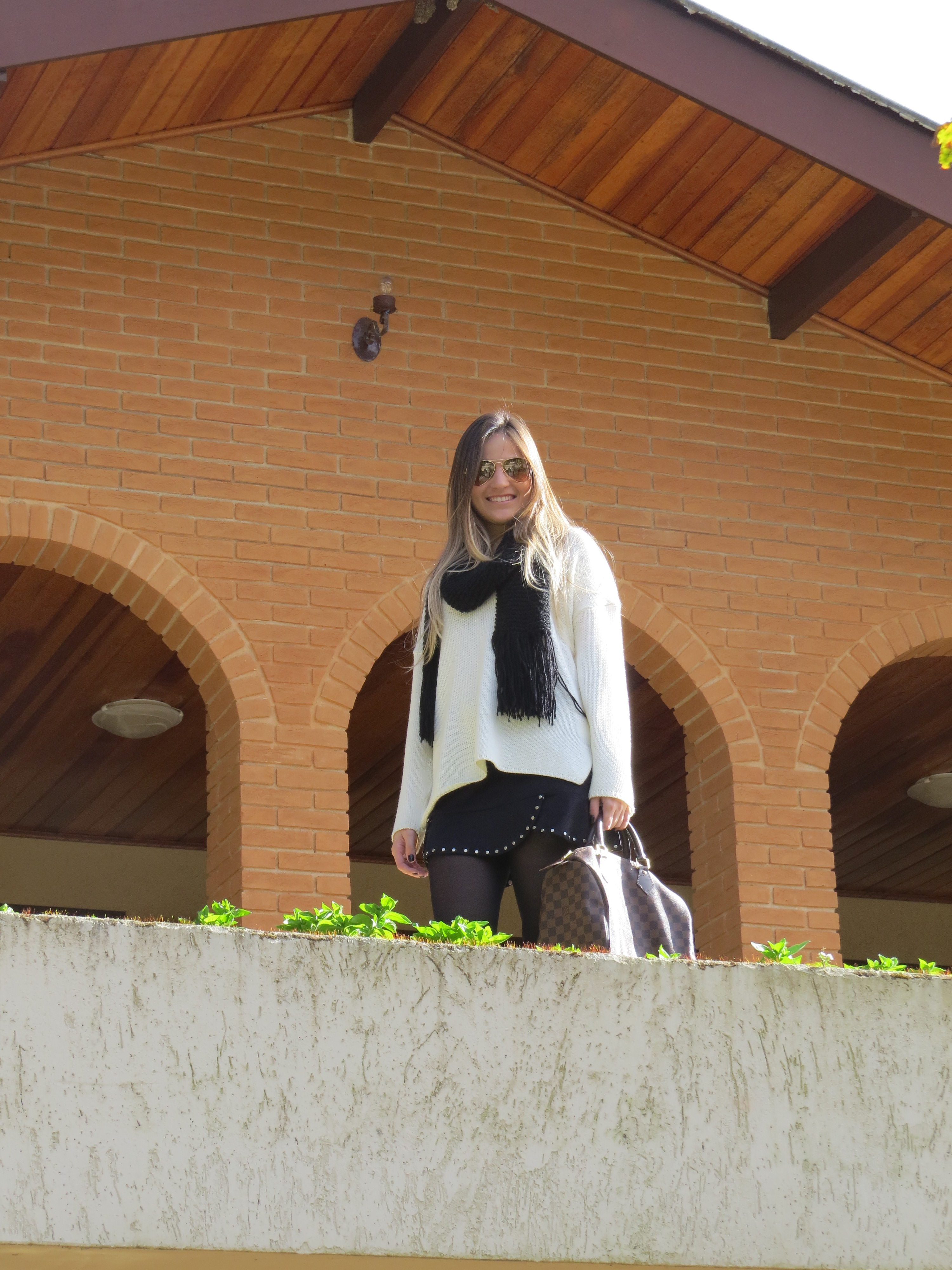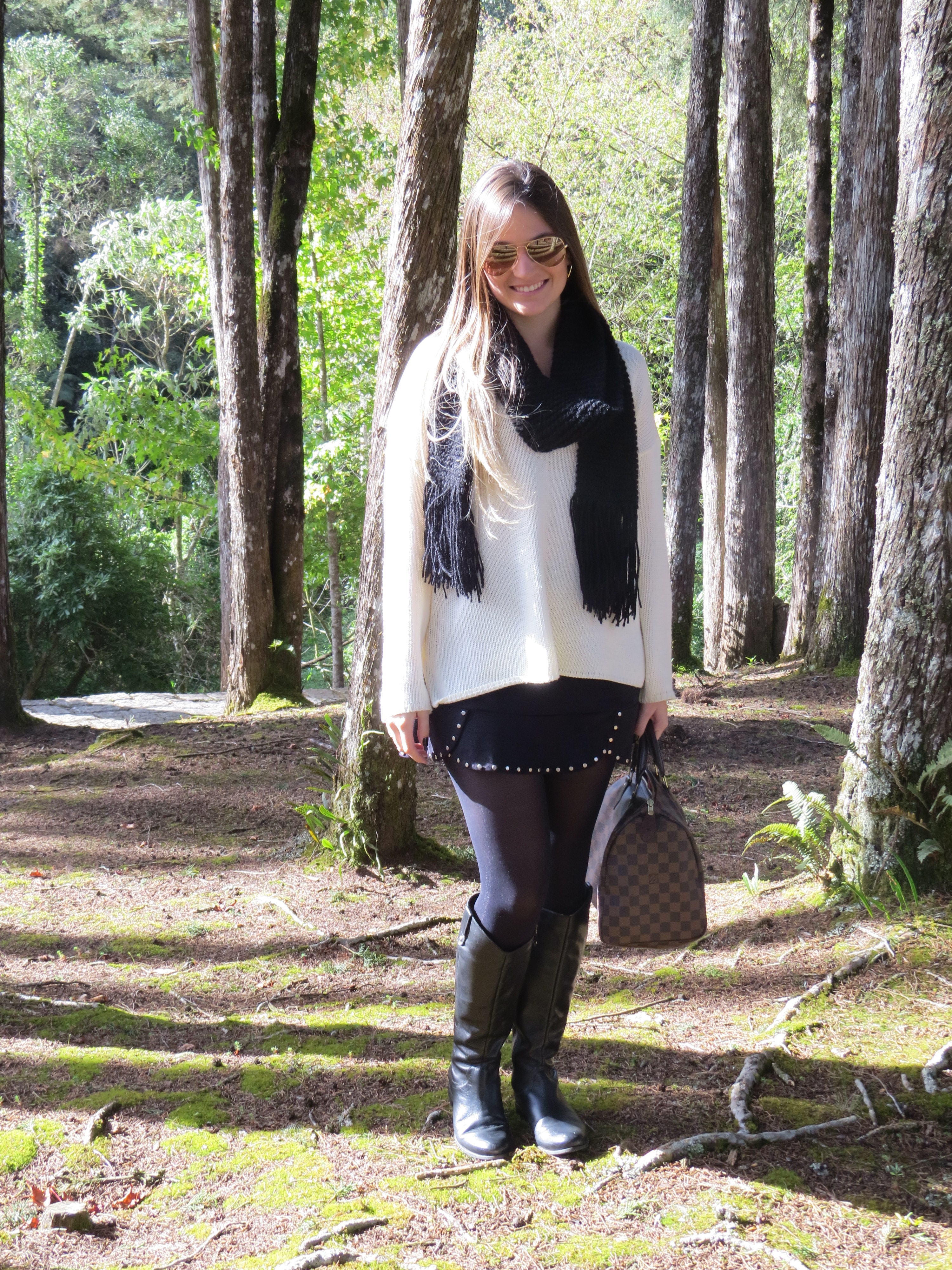 Chegamos na sexta-feira e a tarde estava um clima super gostoso, um sol lindo e aquele friozinho bem suave!! Coloquei meu tricô off white + saia de babados e tachas na barra + cachecol + bota montaria. Confiram!