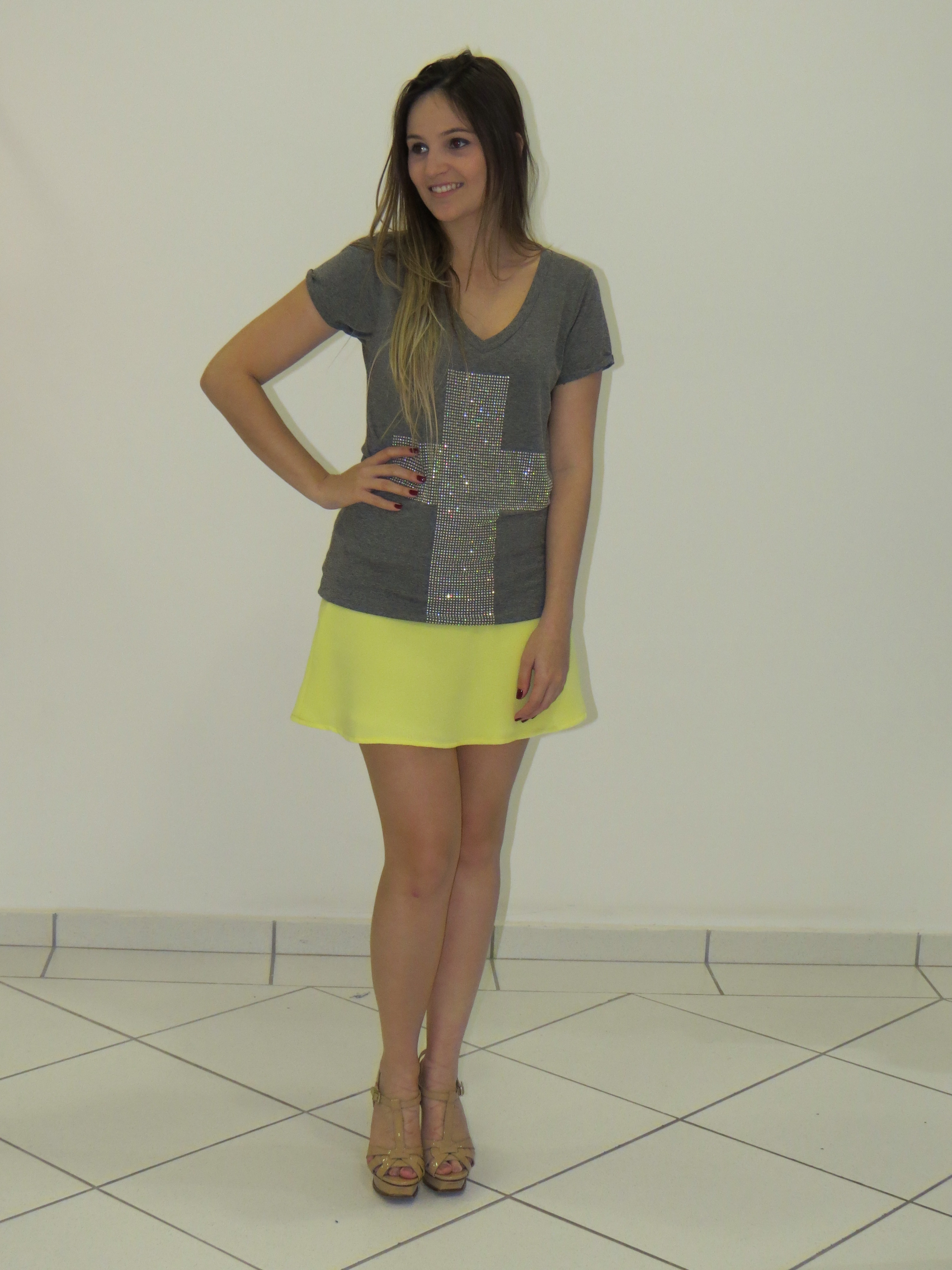 Bom dia meninas… Hoje tem look da Impactto Modas aqui no blog. Minha escolha foi o mix de cores: cinza + amarelo. A t-shirt com aplicação de brilhos formando uma cruz ficou um charme com a saia amarela. É uma produção super básica, mas com uma pegada cool e fashion. Aquele look arrumadinho e super estiloso!