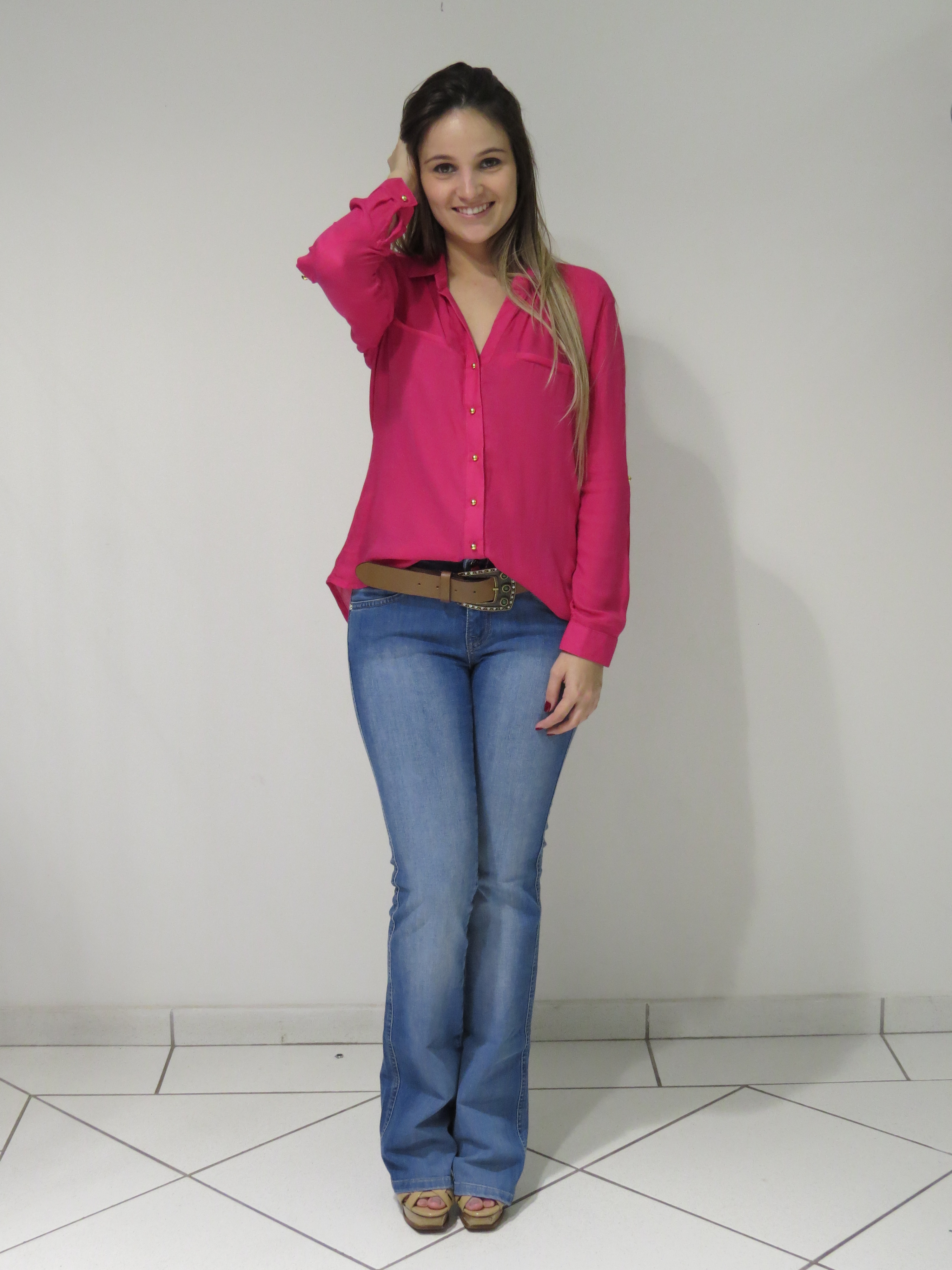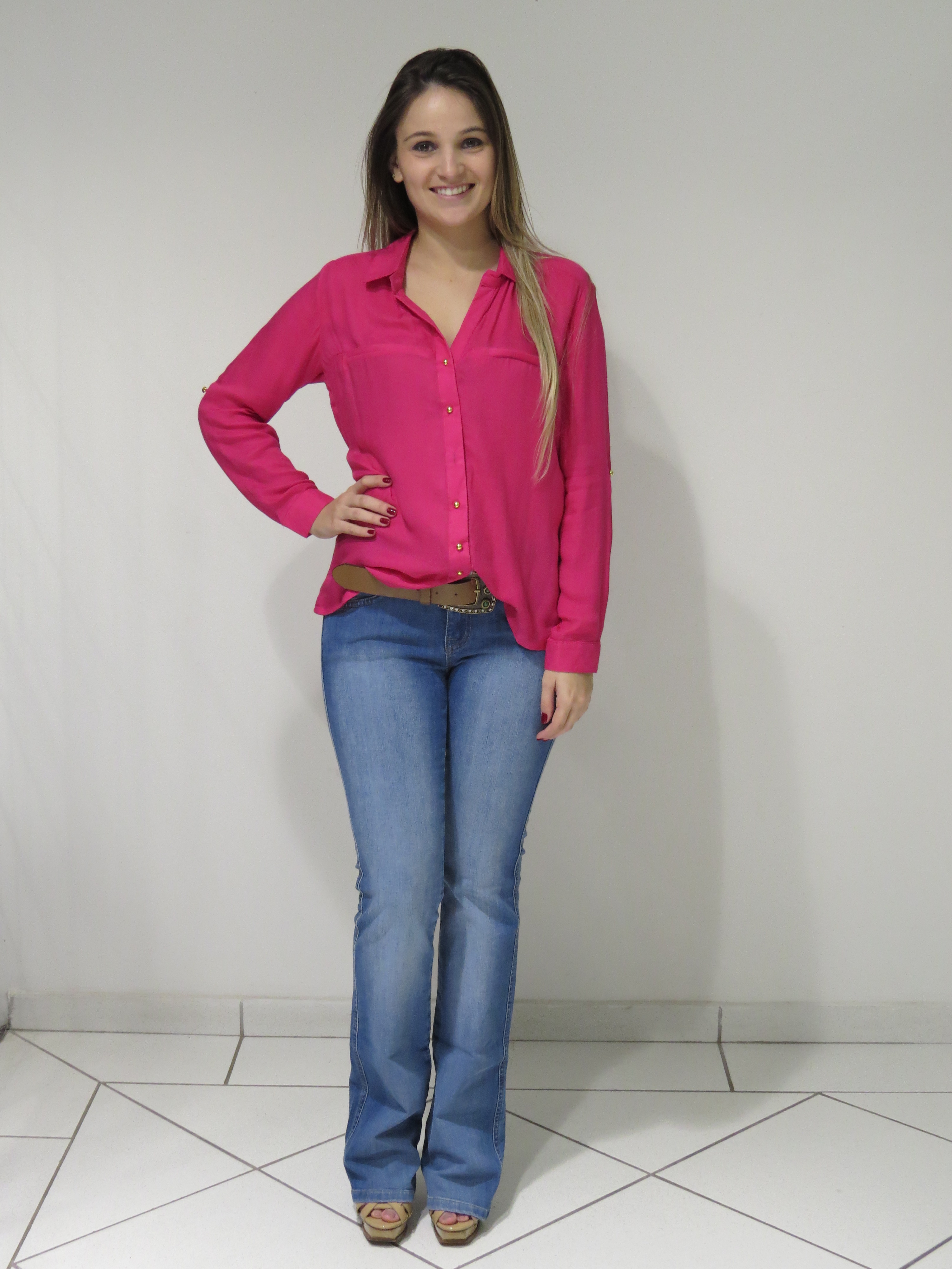 Meninas, queria ter postado esse look da Impactto Modas ontem, mas com a correria da promoção, acabei ficando sem tempo! Pois lá vai… O look é bem básico, ótimo para trabalhar ou usar no dia-a-dia. A produção foi com uma calça flare jeans, que veste super bem, além de ser mega confortável + camisa pink. Adoro camisas de cores vibrantes, dá um UP no look!