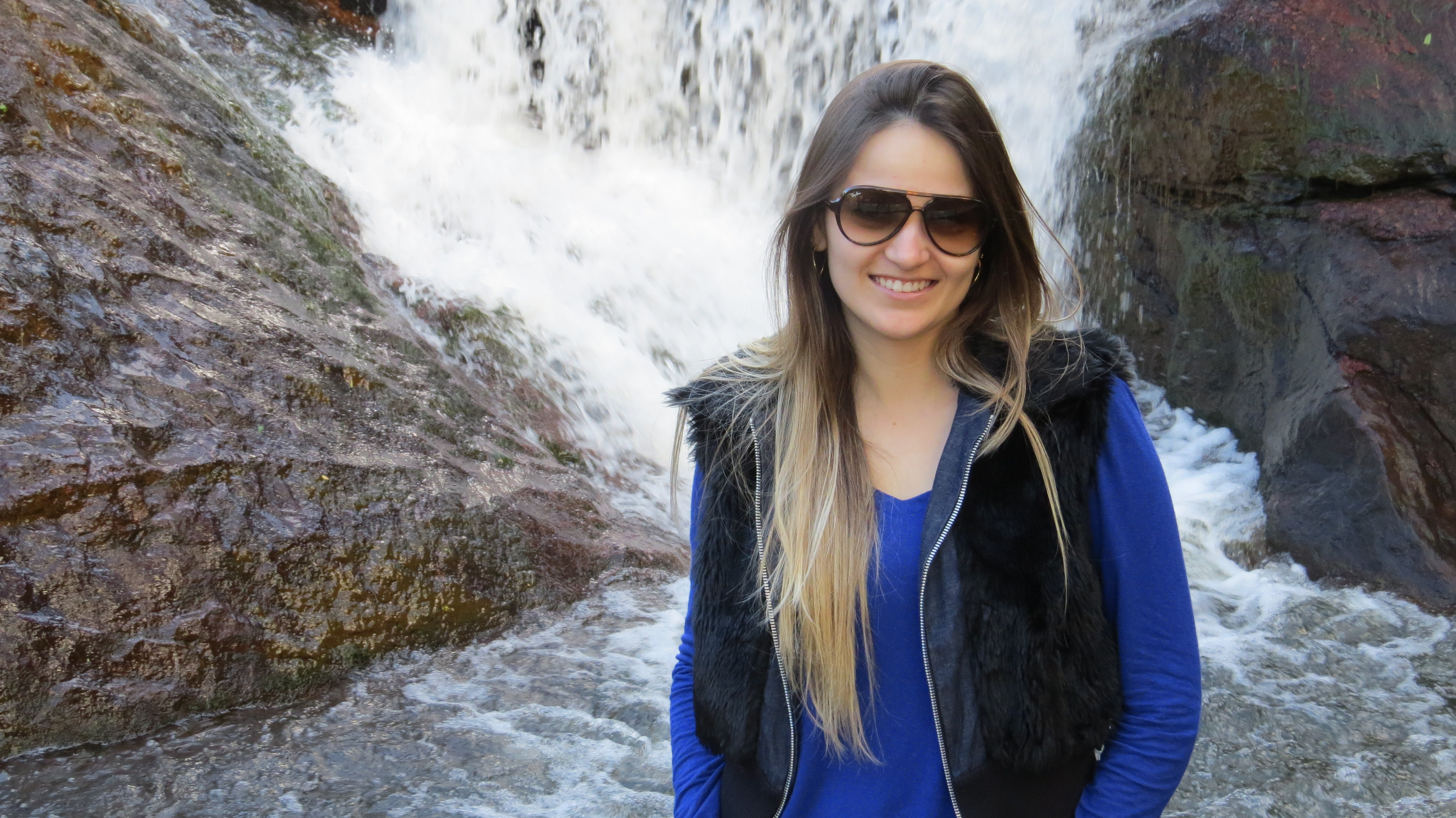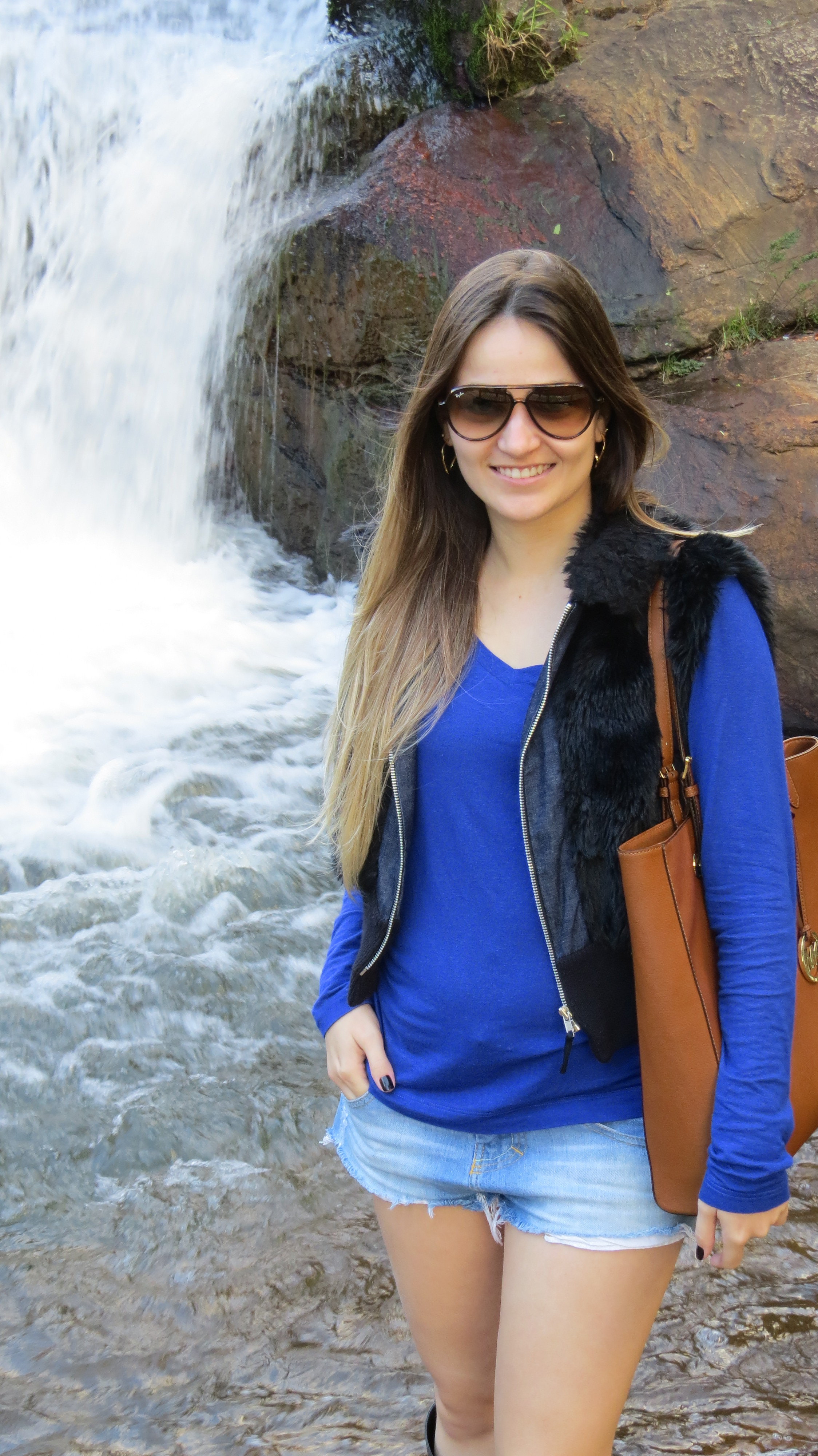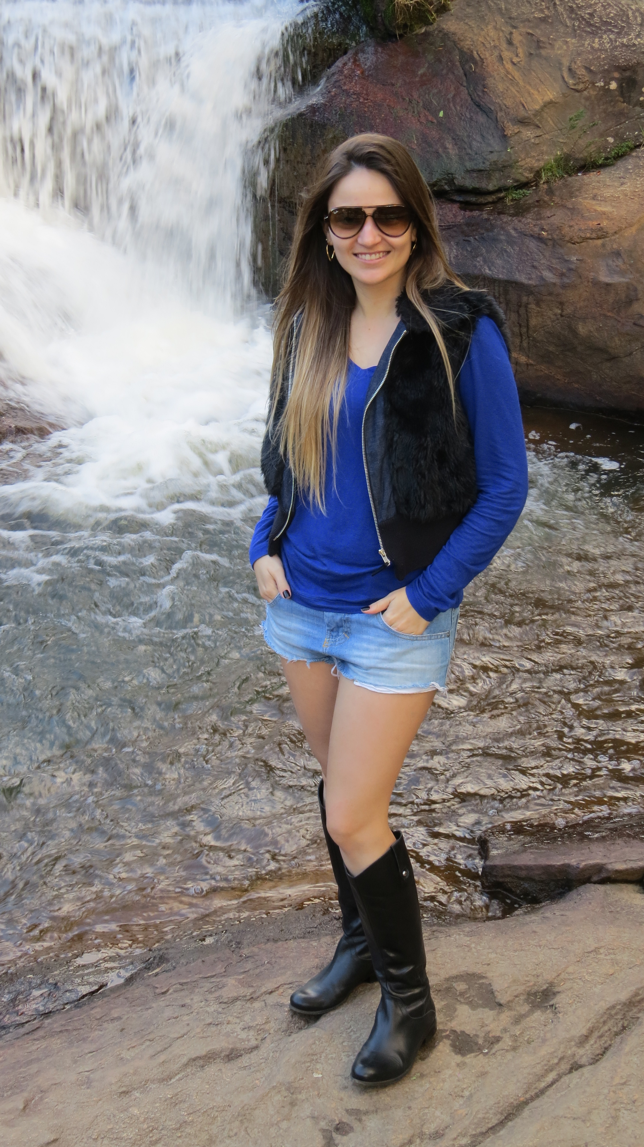 Vamos a mais um look que usei em Campos. Esse foi para um passeio a tarde – estava aquele climinha gostoso – sol e friozinho! Usei um short jeans detonado (era uma bermuda que eu mesma rasguei e cortei) + malha azul royal + colete de pelos + bota montaria. Como não estava muito frio, esse look foi o ideal.