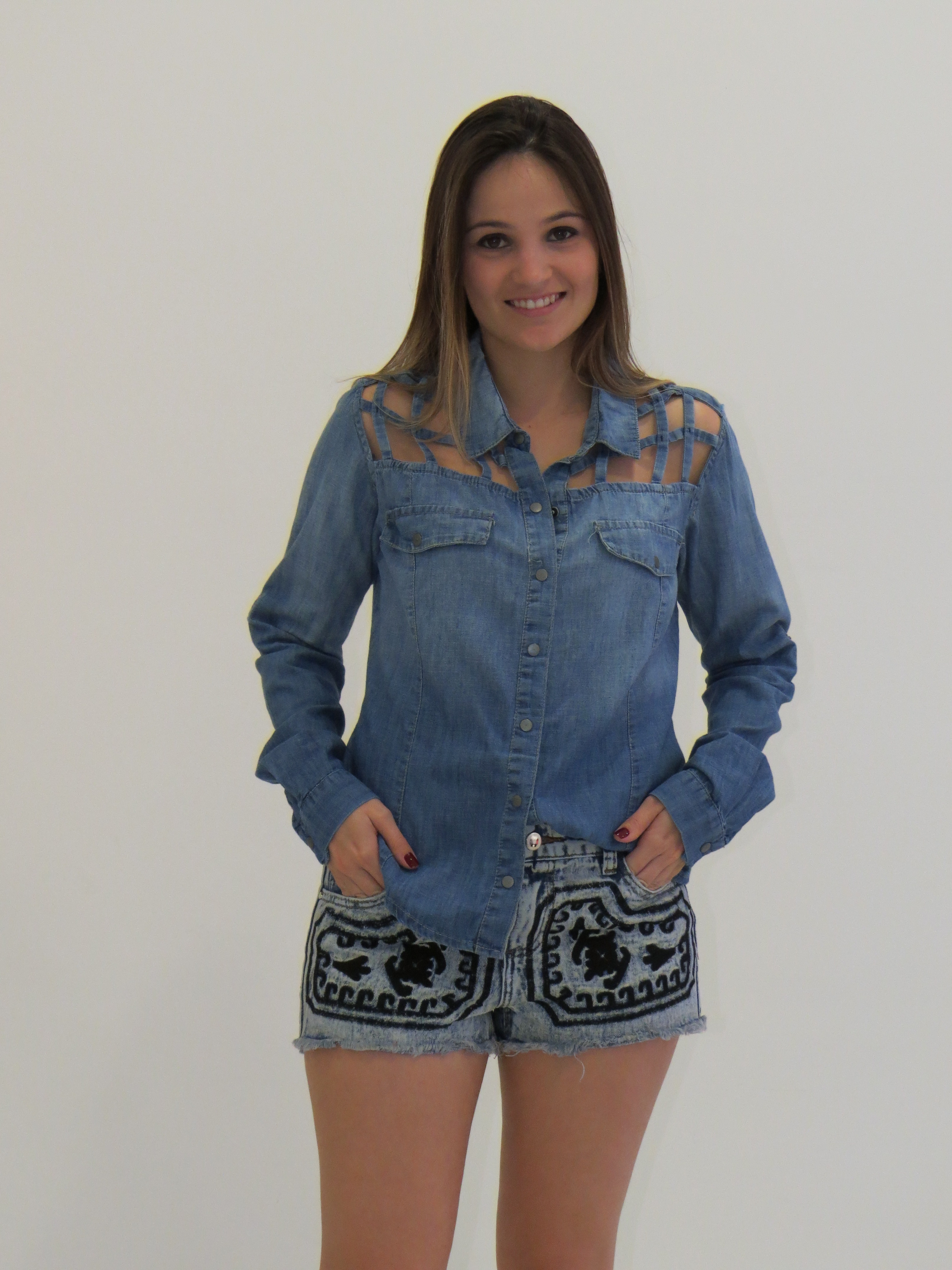 No look coloquei um shortinho jeans étnico + camisa jeans com recortes na parte de cima. Super estiloso!