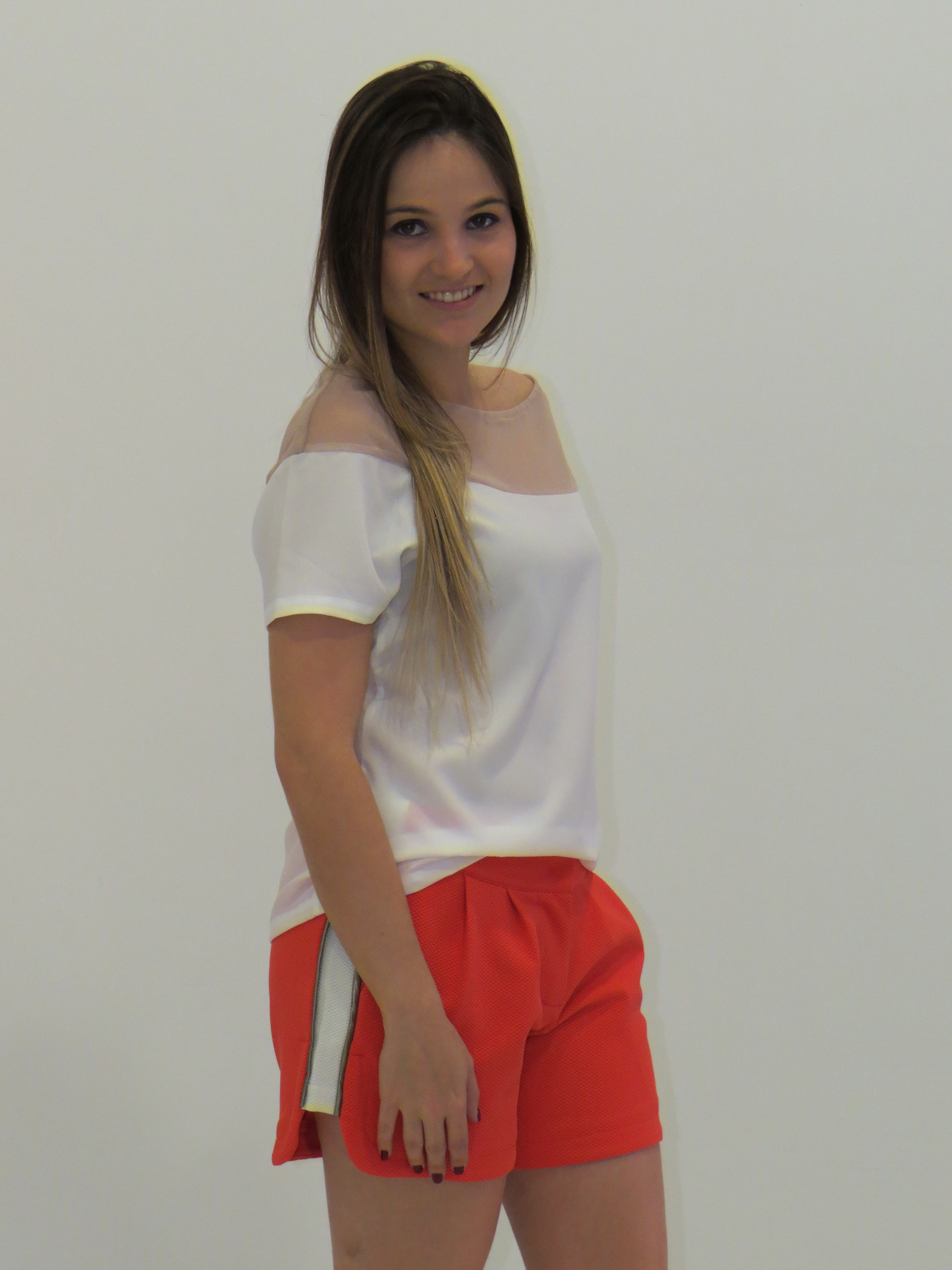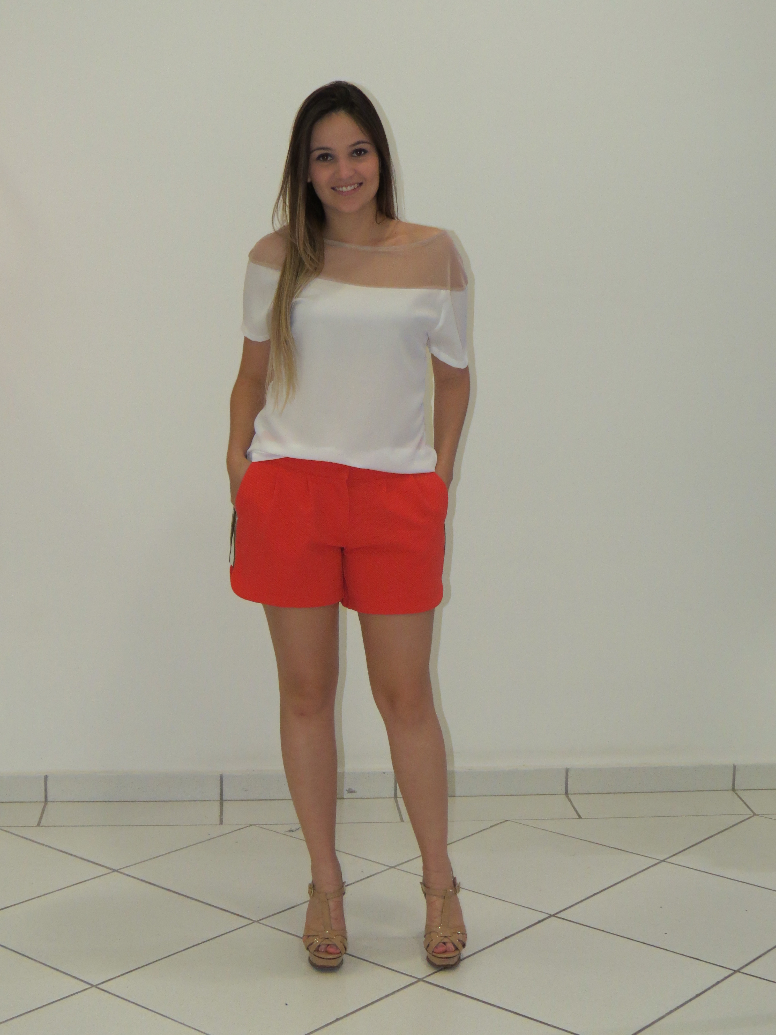 Um look que saiu das academias para os Street Styles foi o shortinho boxer. E o look da Impactto Modas de hoje é com ele. O bacana é que uma peça super básica, pode ser usada em looks mais elaborados e ficar chique. O modelo que escolhi é de piquet, na cor coral com uma faixa off white na lateral e contorno metalizado. Usei com uma blusa de seda branca com detalhe de tule na parte de cima, vejam!