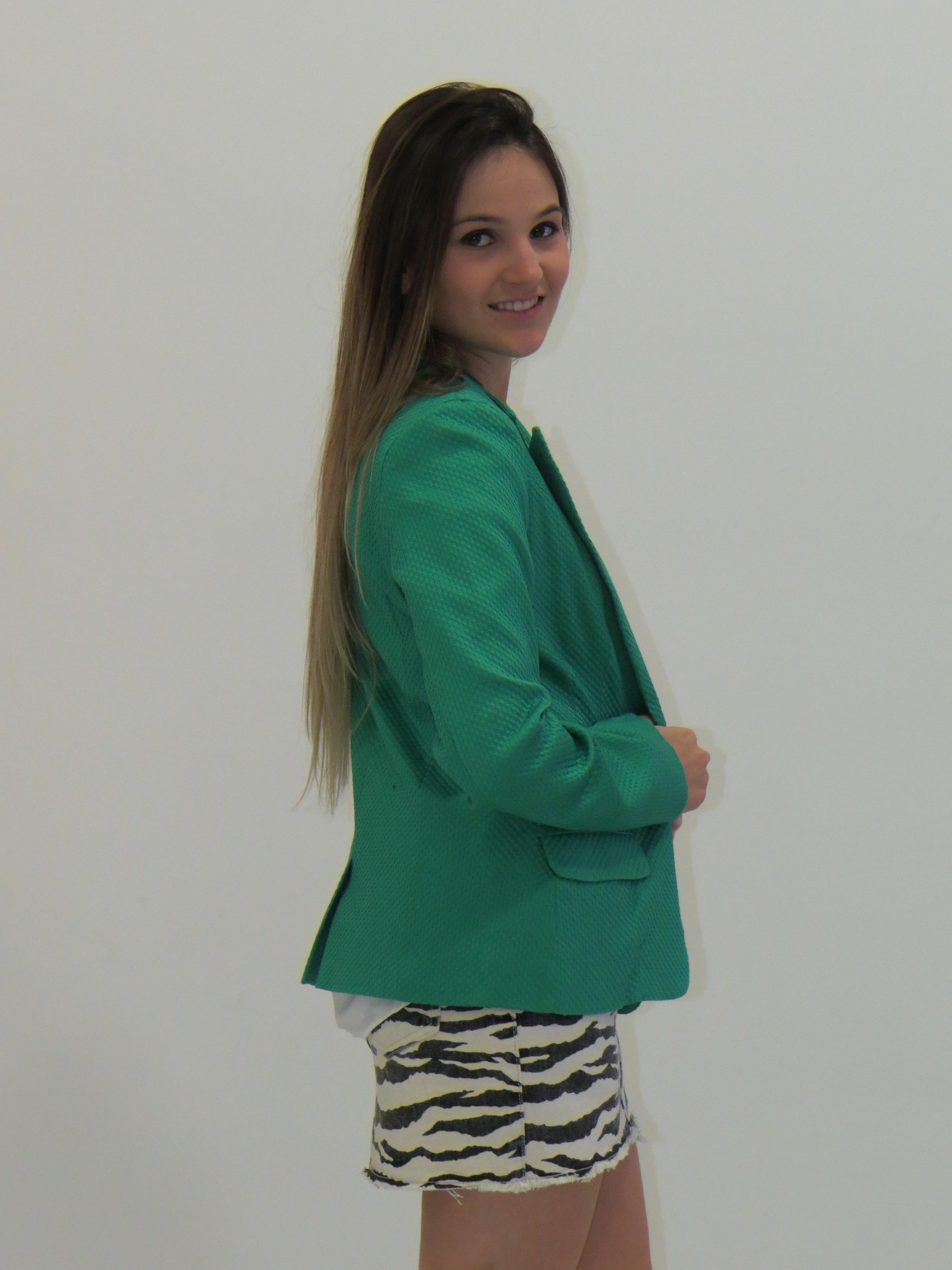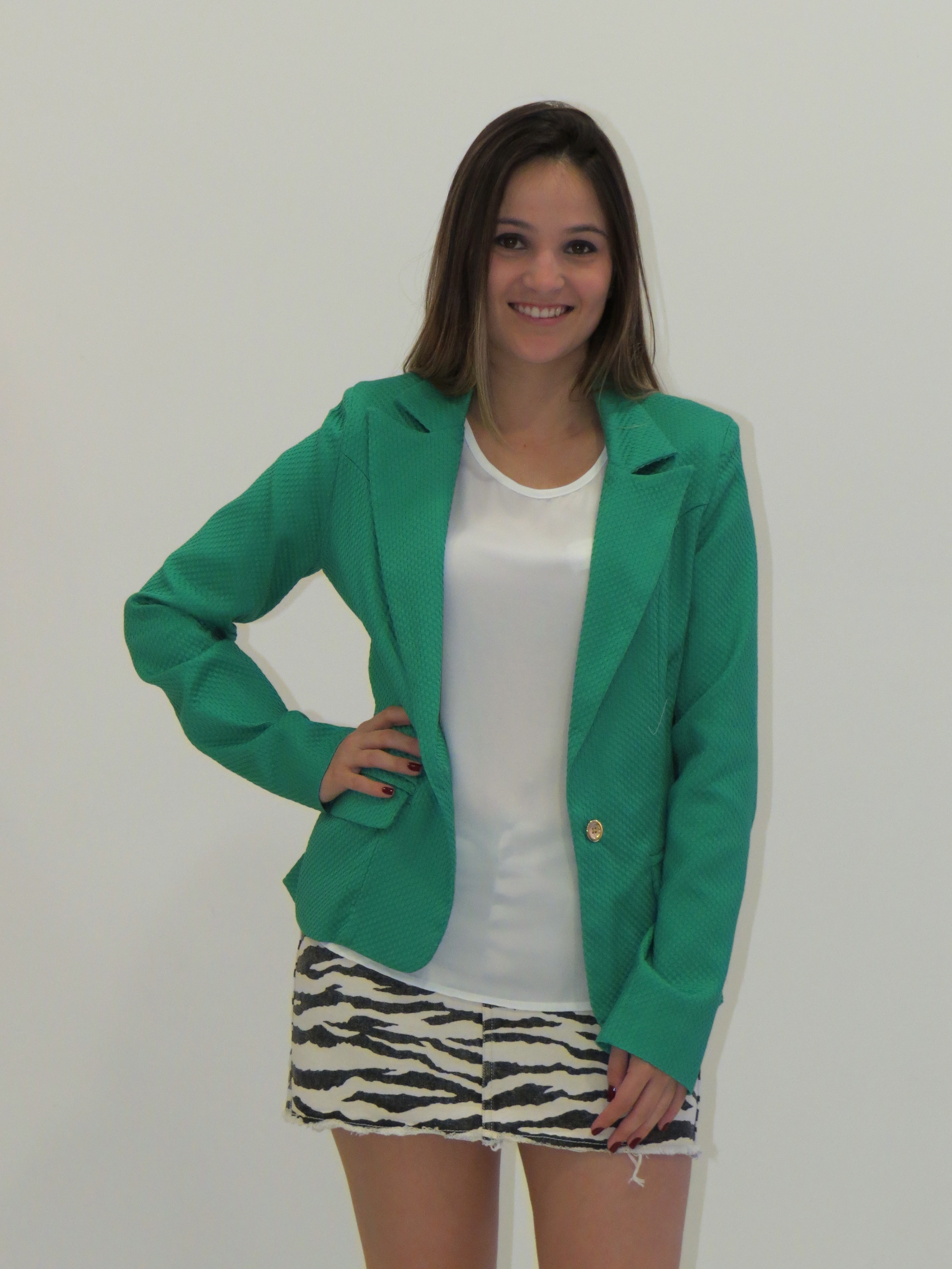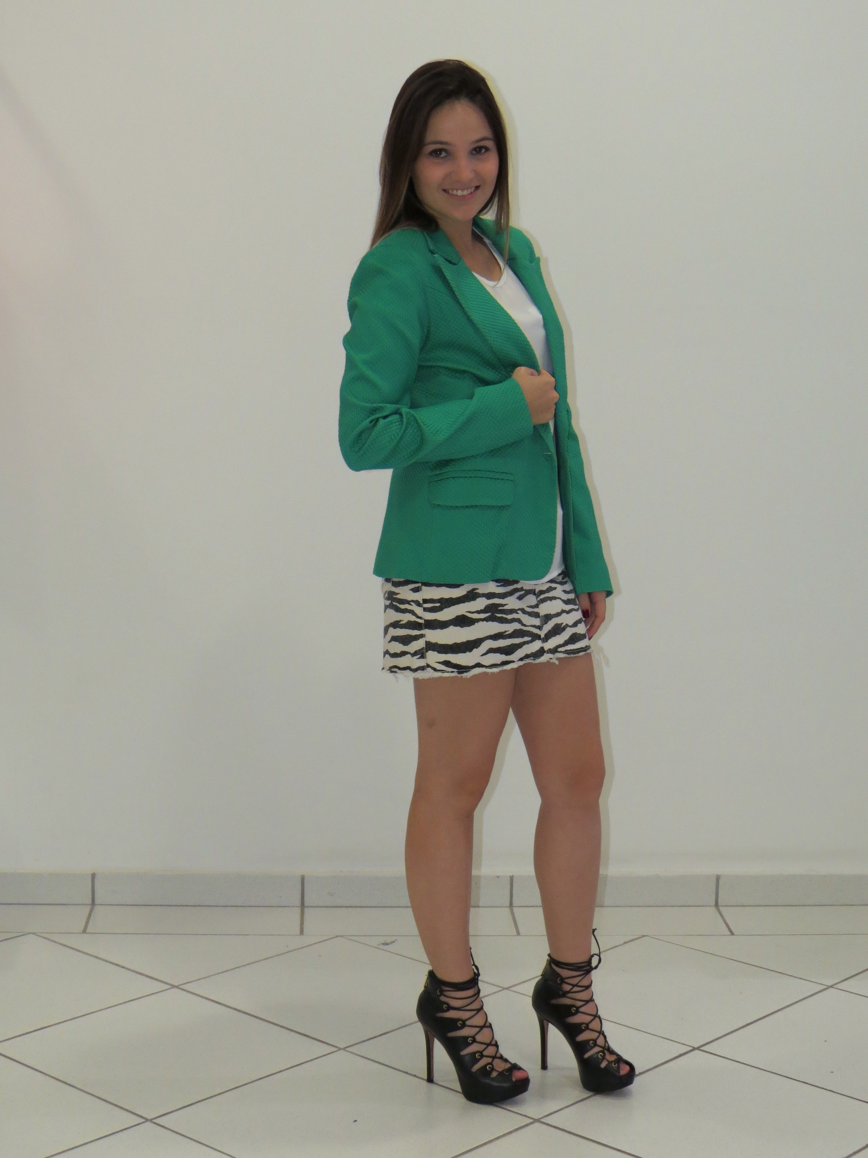 Olá meninas, hoje o clima amanheceu bem gelado por aqui. Então, lá vai uma proposta da Impactto Modas com a peça que é chave nos dias mais frios – o blazer. Minha escolha foi um look P&B, usei a saia com estampa de zebra + blusa branca. Para dar cor e vida ao look, joguei o blazer verde bandeira. Vejam o resultado.