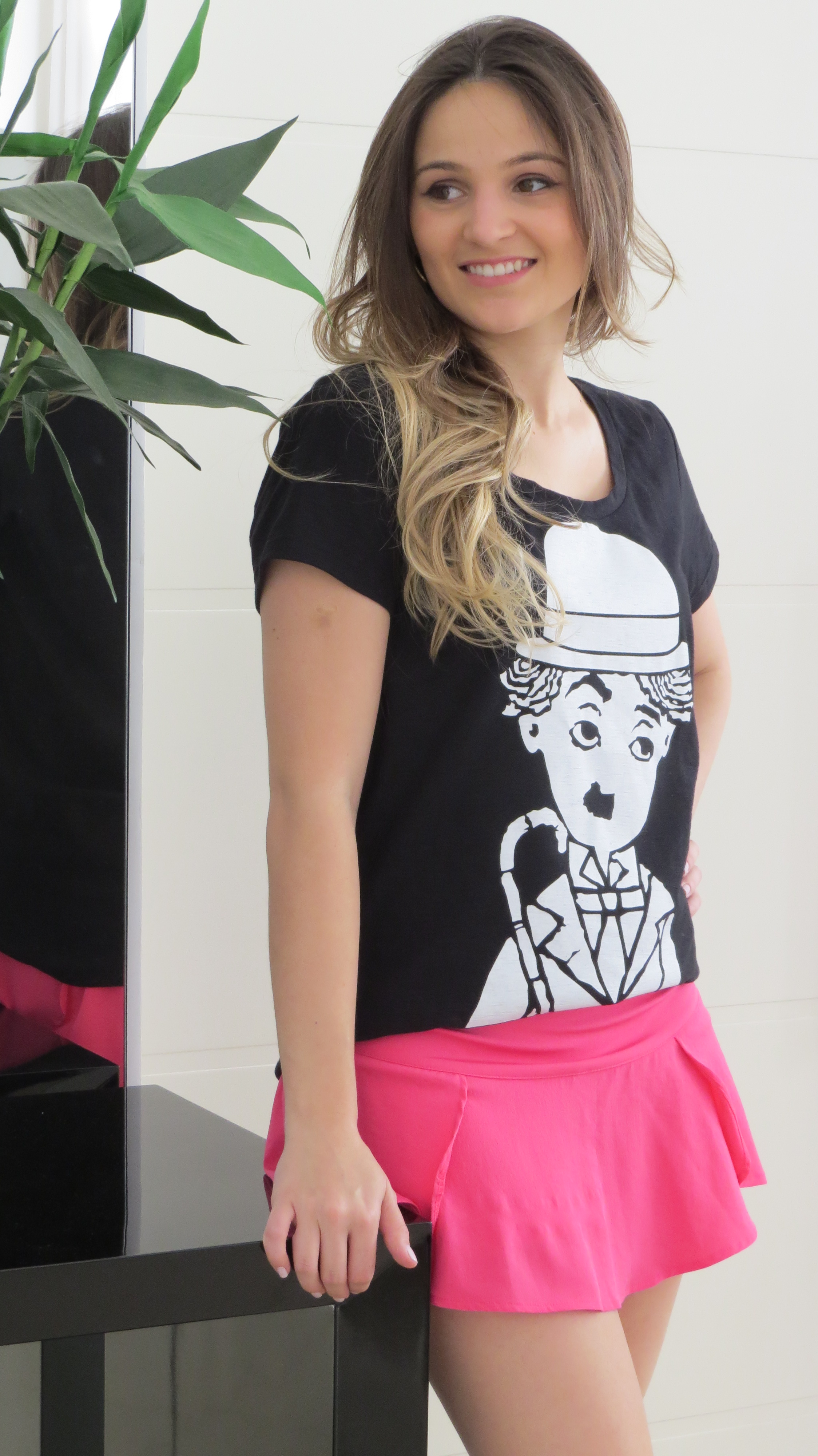 O look da Impactto Modas dessa terça-feira é cool & chique ao mesmo tempo!!! Uma produção aparentemente básica, com uma t-shirt, mas o short saia e a sandália mais glamorosa deram um ar mais arrumadinho no look. A tee é uma graça, com a estampa do Charles Chaplin. Adoro esse combinação P&B da camiseta com uma cor mais vibrante, no caso o pink do short saia. Vejam!