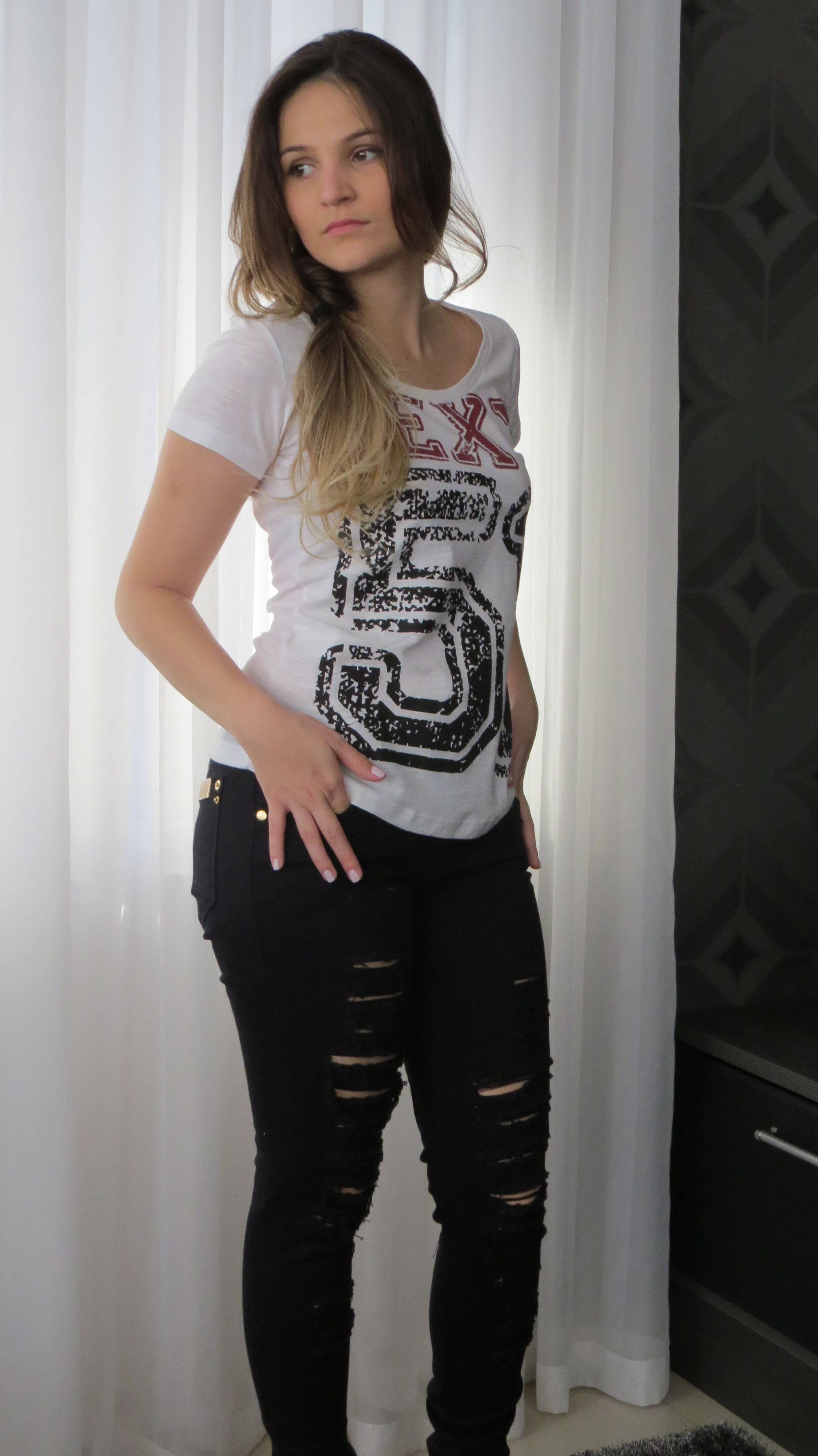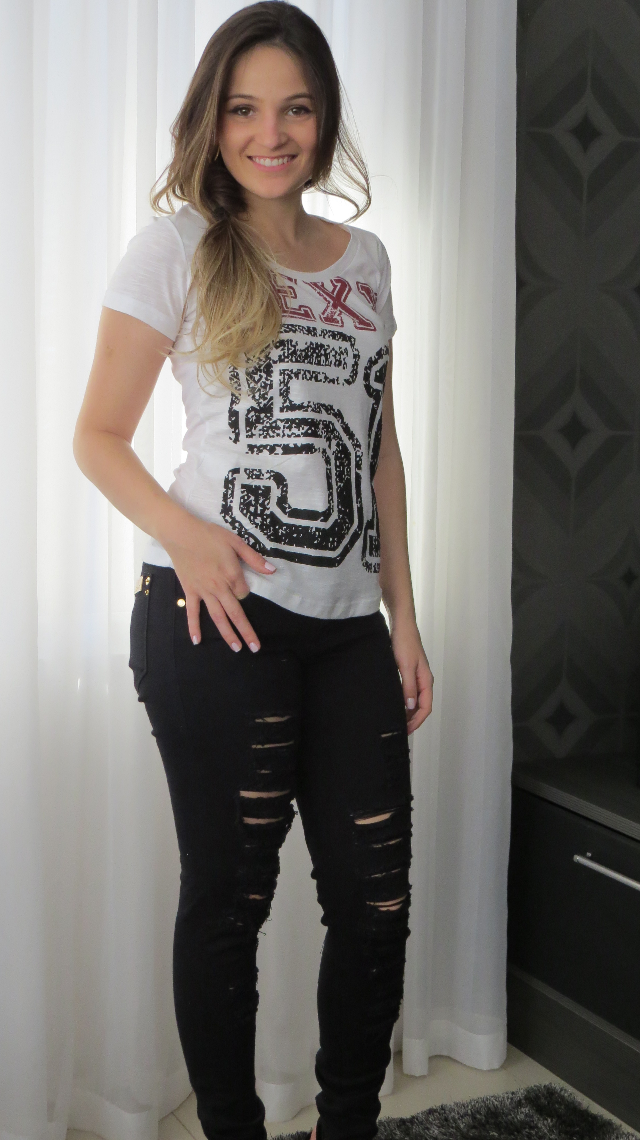 Olá girls! O look da Impactto Modas de hoje é mais básico, porém super moderno. Na produção a super queridinha do momento – calça destroyed + t-shirt! Quer combinação mais confortável e cool que essa?! Impossível.