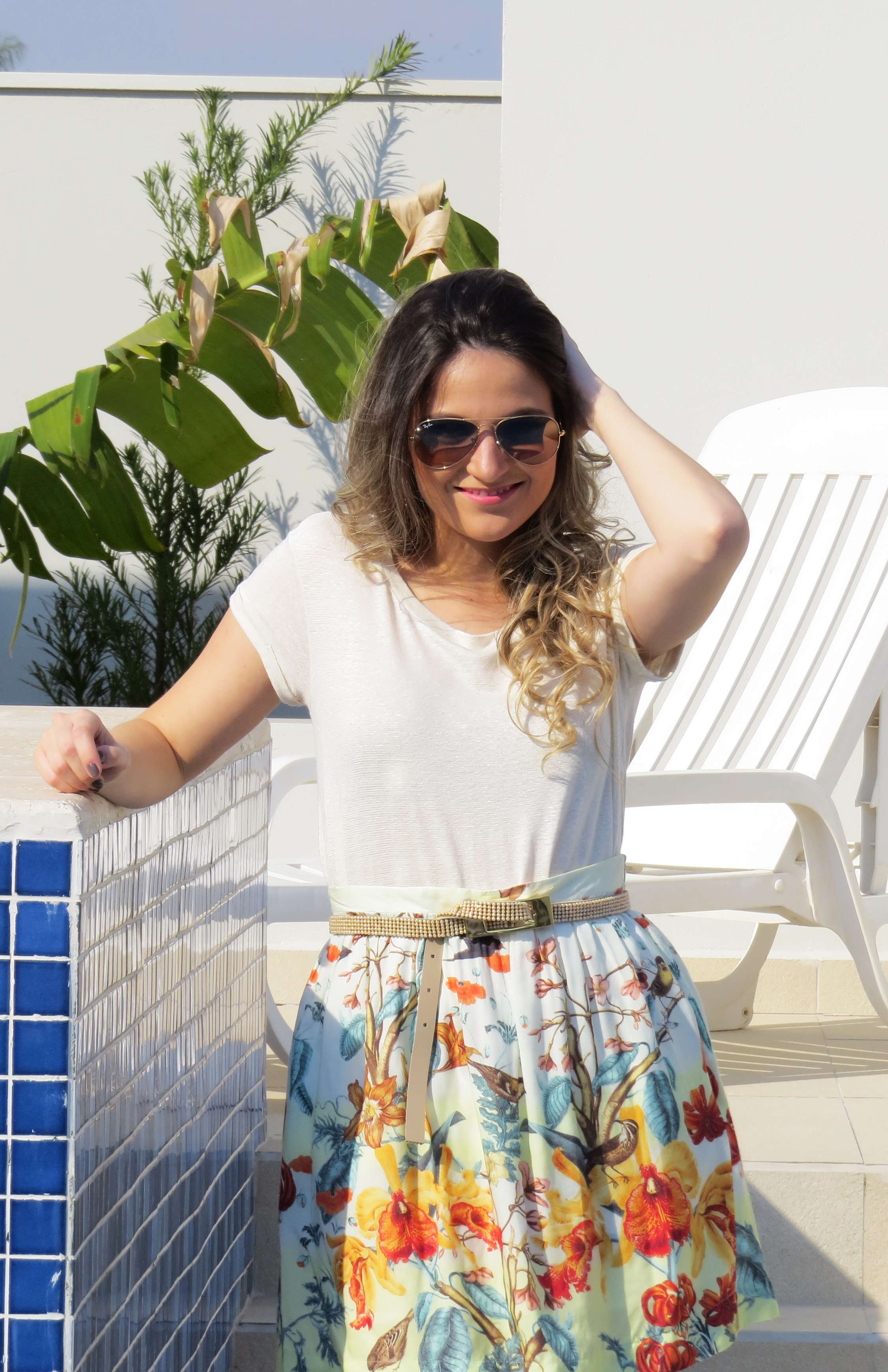 As peças da coleção de verão já estão chegando. Muitas estampas florais e delicadas. Essa estação promete ser super meiga e feminina. No look da Impactto Modas de hoje usei saia floral de cós alto + t-shirt nude + cinto de pérolas. Vejam!