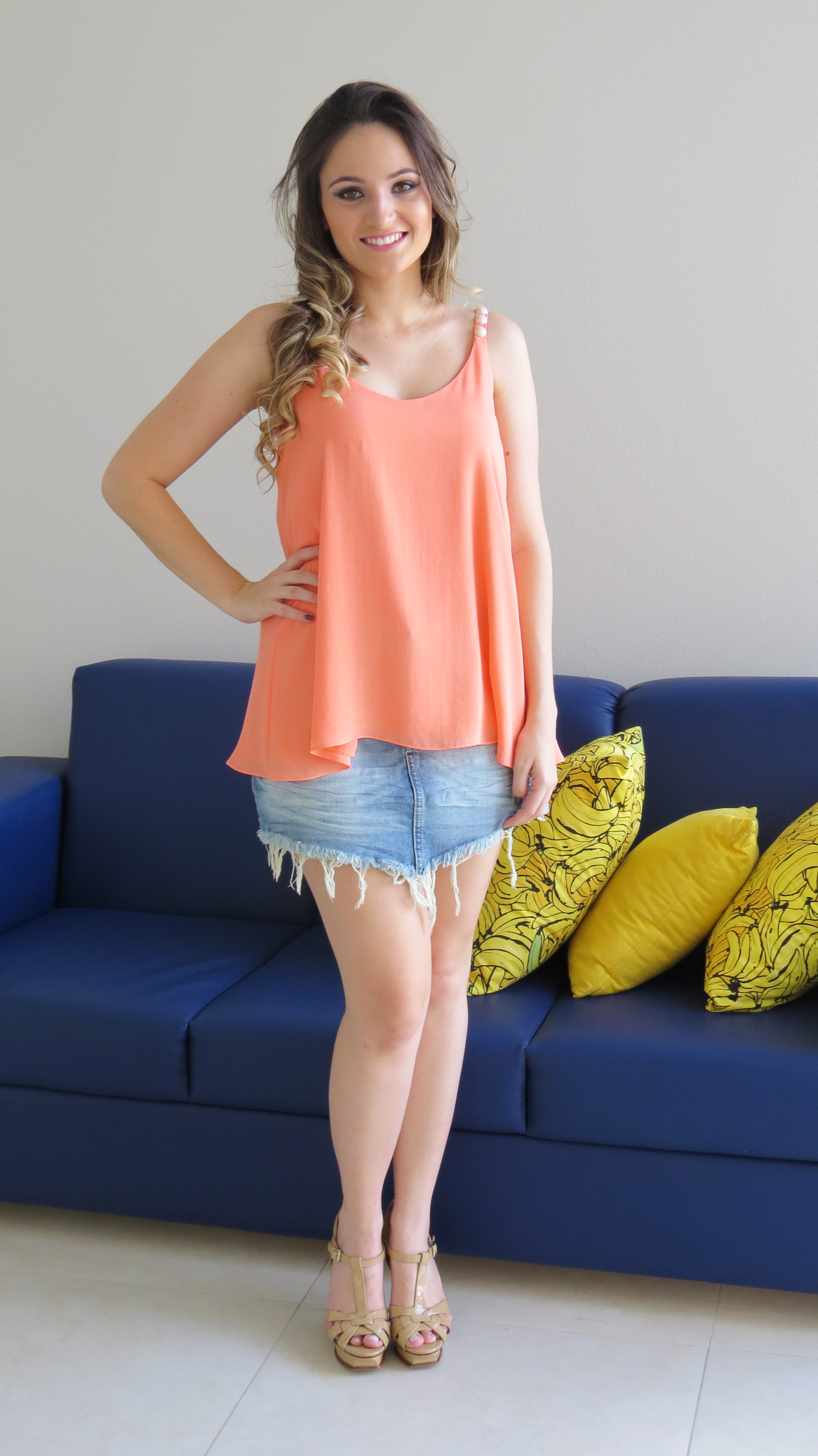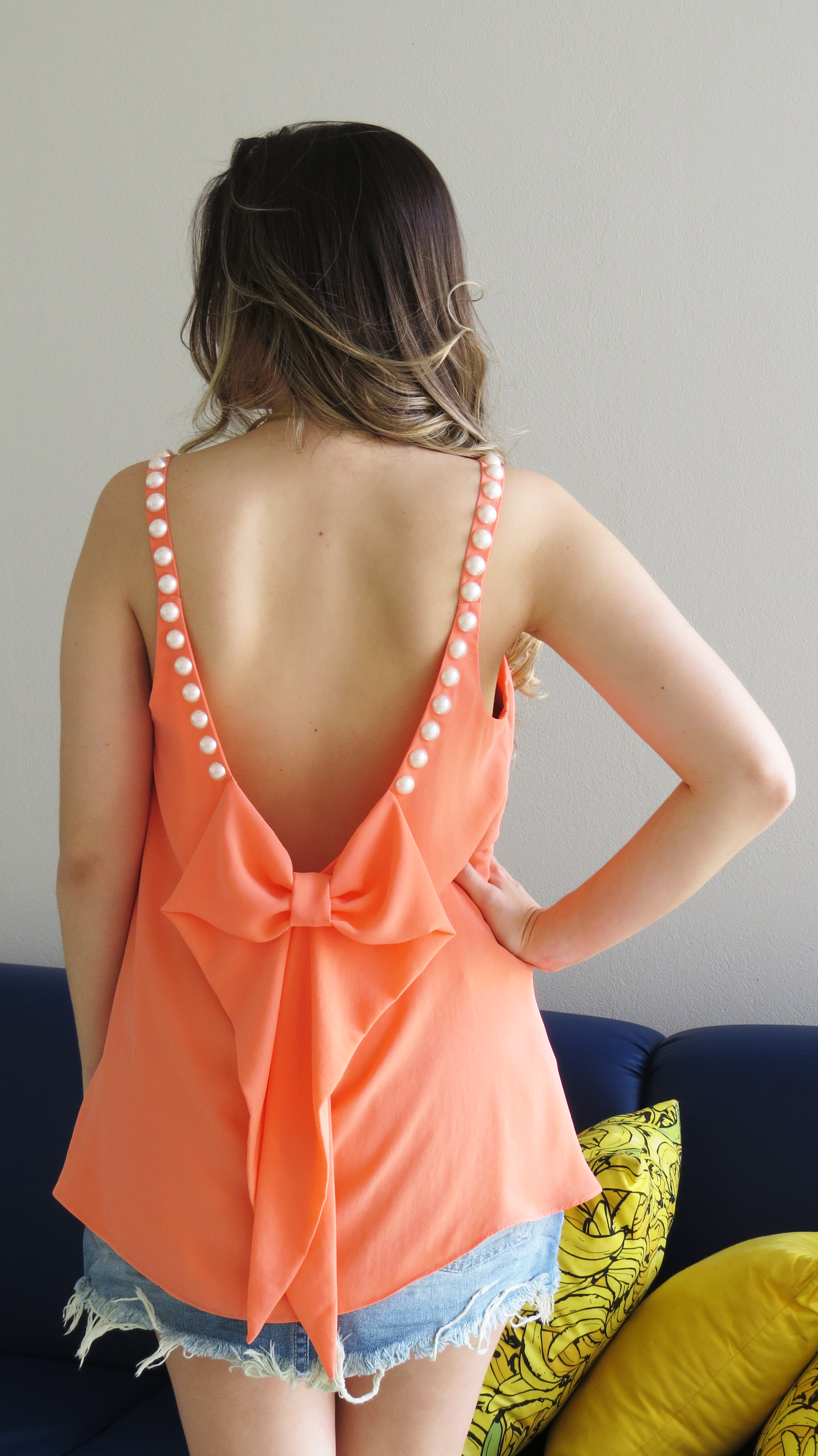 O look da Impactto Modas de hoje é com uma saia jeans destroyed – que está super em alta! Com ela usei essa blusa bárbara de decote V nas costas, detalhe de laço e alça toda bordada em pérolas. Linda, linda, linda!